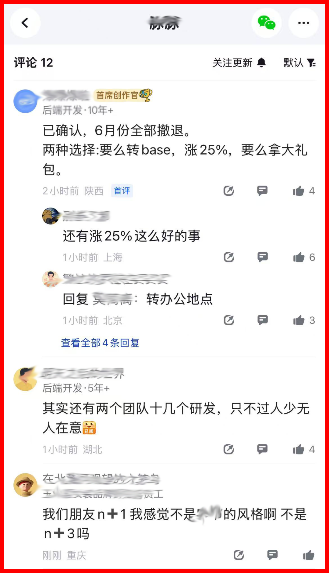 比直接裁员更耐人寻味的,是公司提出的另一个选项:转岗至其他城市,薪资上涨25%。