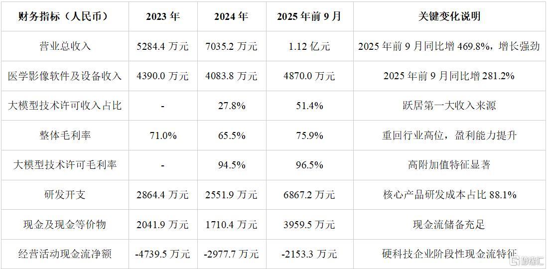 作为深耕医学影像AI赛道九年的硬科技企业,德适生物以自主研发为核心,商业化成果与财务表现持续爆发。据招股书,2025年前9个月,公司营收同比暴涨469.8%,大模型技术许可业务毛利率高达96.5%,一跃成为第一大收入来源。本文通过分析其技术壁垒、业务布局、行业机遇与潜在风险,全面拆解这家医疗科技独角兽的底色。