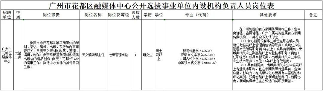 花都区融媒体中心图文编辑部主任1名,详见《广州市花都区融媒体中心公开选拔事业单位内设机构负责人员岗位表》(附件1,以下简称《岗位表》)。